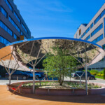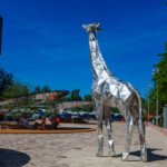 In collaboration with the “Eeter” architects, we designed a giraffe sculpture and three circular pavilions. The 5.5-meter tall giraffe is made up of 700 aluminum metal pieces and serves as the central object of the park. The three pavilions, with diameters ranging from 8.5 to 9.5 meters, protect park visitors from direct sunlight and precipitation. Their mirror surfaces are made of stainless steel. The chosen materials ensure the object’s durability and a shiny visual appearance in any weather conditions. Additionally, in Giraffe Park, we designed and installed two smoking areas that blend into the overall landscape. We are proud of our work, as this project was full of challenges, from design and development to installation. We have expanded our experience in developing non-standard objects and look forward to applying it in the future.